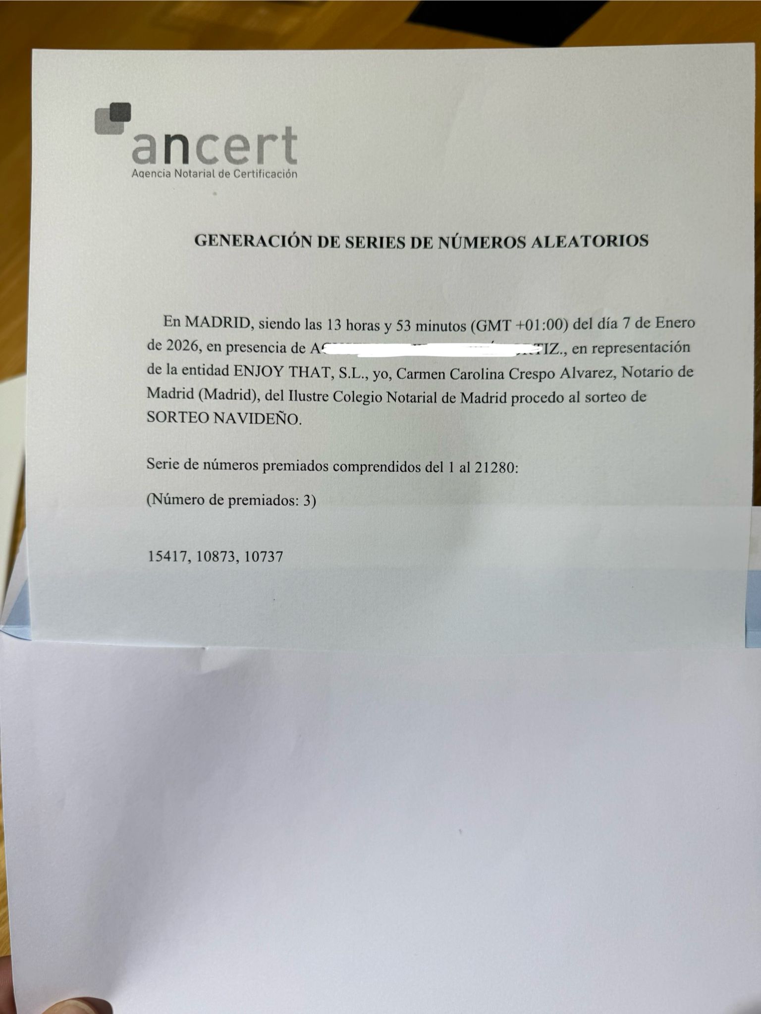 Realizado el día 7/01/26 ante notario y publicados los ganadores en www.madnesslight.com/sorteo y en la app de Élite Events ese mismo día a las 20:00h.